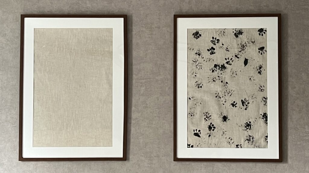 Sommige momenten wil je niet alleen bewaren in een fotoalbum, maar écht een plek geven in huis. Iets dat je elke dag ziet en waar je meteen blij van wordt. Onze slaapkamerwand keek me al een tijdje wat saai aan, dus ik besloot er een vleugje persoonlijkheid aan toe te voegen. Pootafdruk van onze kat op linnen. Met wat diervriendelijke verf, een (lichtelijk gedwongen) kat en nat doek voor de zekerheid, gingen we aan de slag. Het werd een speels patroon. Geen enkele afdruk is hetzelfde en dat maakt het juist zo charmant.