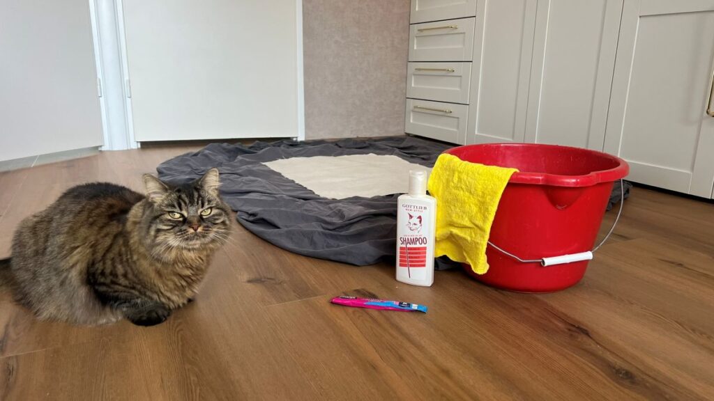 Ze had er duidelijk zin in. Althans, tot ze doorhad dat de kattenshampoo óók onderdeel van het plan was. Met een liquid snack als omkoper en een sopje in de aanslag, waren we er klaar voor. Tip: doe dit project buiten of leg er een oud doek onder, want geloof me… die pootjes blijven zelden keurig binnen de lijntjes.