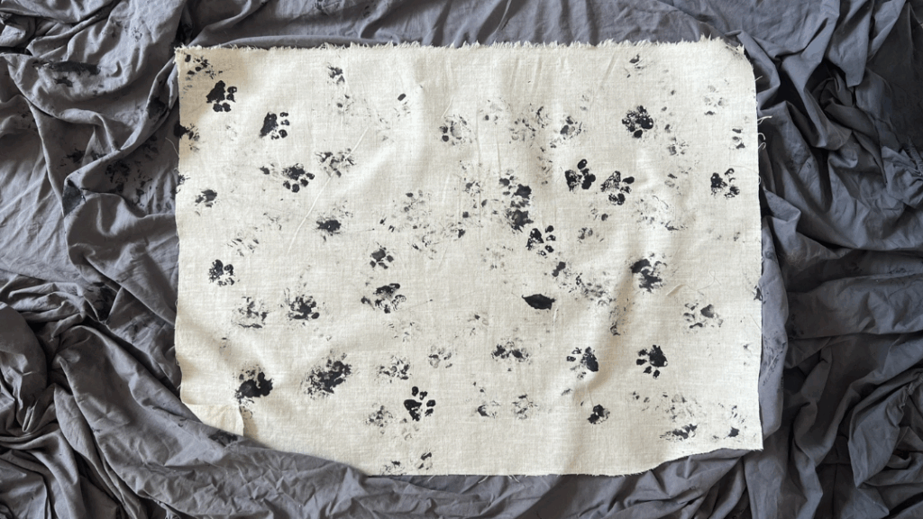Belangrijk: gebruik altijd verf die veilig is voor pootjes. Ik koos voor zwarte acrylverf op waterbasis. De soort waar kinderen mee vingerverven. Veilig, makkelijk schoon te maken én perfect voor kleine kunstenaars met haren.
