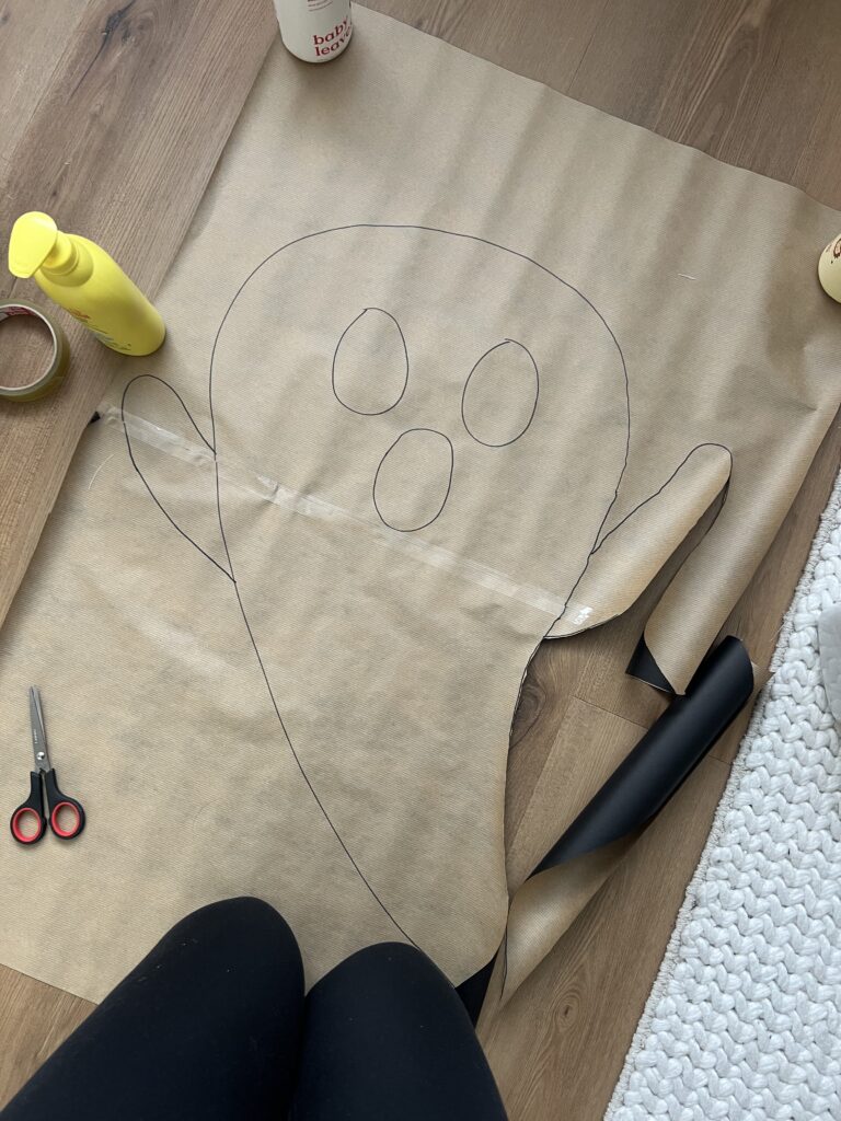 Oké, tijd voor het échte werk. Eerst knip je het vitragegordijn op maat en plak je het netjes op je ramen. Geen hogere wiskunde, gewoon een beetje knippen en dat hoeft echt niet perfect. Daarna teken je de spookjes op het zwarte kaftpapier. Grote, kleine, met boze glimlachjes: leef je uit. Dan knip je ze uit en plak je ze tegen het vitrage aan. Overdag zie je er bijna niks van. Maar zodra het donker wordt en je binnen het licht aansteekt… tadaaa! Dan verschijnen ze ineens. Spoken voor je ramen! Het is zó simpel, maar het ziet eruit alsof je uren bezig bent geweest. Hoe leuk is dat?