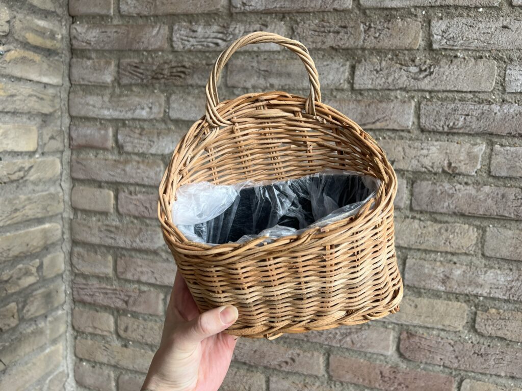 Ik dook onze tuin in en vond nog wat restjes dakbedekking. Ja echt, zo’n typisch geval van waarom hebben we dit nog, maar ineens was het perfect. Die heb ik aan de binnenkant van de rieten hangmand verwerkt en daaroverheen nog een plastic zakje gedaan. En voilà, een waterdichte bloemenmand voor je voordeur. Maar ik snap: niet iedereen heeft random dakbedekking liggen. Gelukkig kun je dit net zo makkelijk oplossen met alleen een stevig plastic zakje. Of je zet er een klein plastic bloempotje in. Werkt net zo goed en maakt je rieten hangmand voor buiten meteen praktisch.