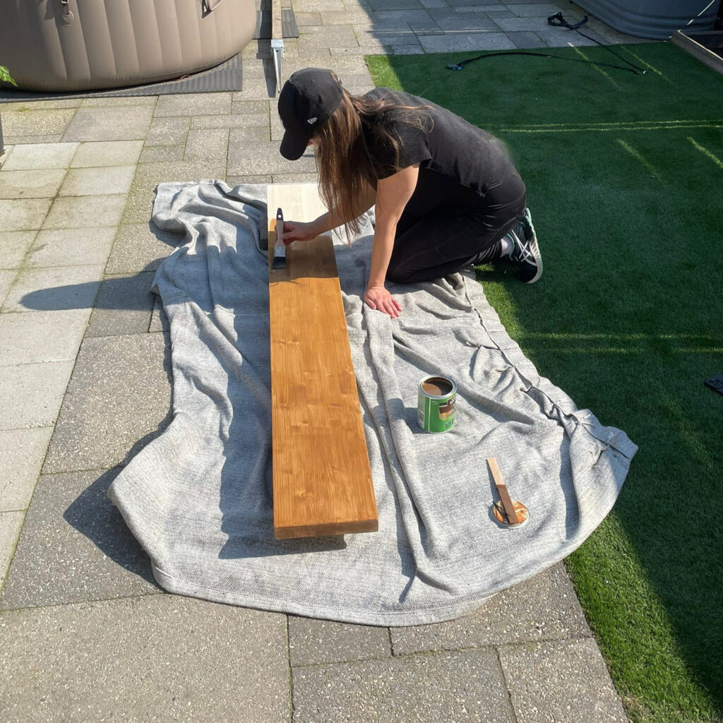 Een tip die wij kregen: gebruik ongeveer 4 lagen vernis. En waarom specifiek vernis? Nou, omdat dit zorgt voor een beschermend laagje tegen schimmels, vocht, UV-stralingen, stoten en krassen. Vernis sluit het hout volledig af, terwijl met beits het hout goed kan blijven ademen. Wij hadden nog beits staan en we vroegen na of we eerst konden beitsen en daarna vernis. Dat kon gelukkig wel! Dus dat betekent 3 lagen beits en vervolgens het hout ‘afgesloten’ met 1 laag vernis. Dus dat hebben we gedaan. Je kunt de beits dus ook overslaan!