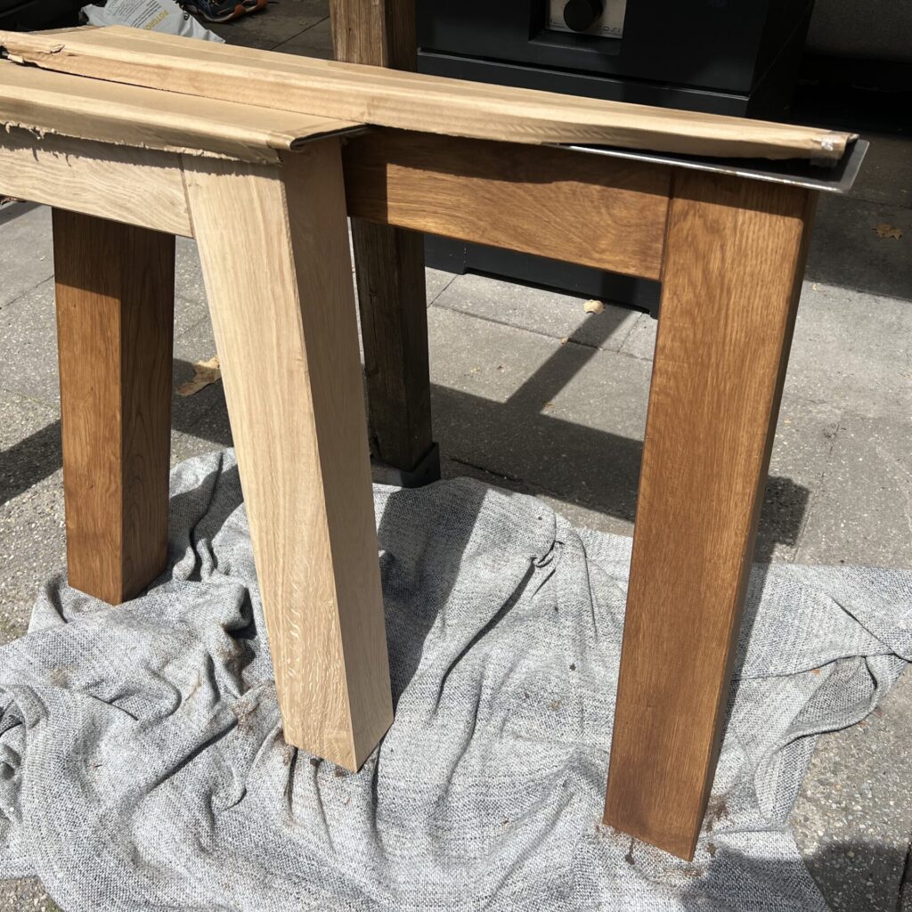 - 2 blikken beits van 750 ml (als je ook de tafelpoten doet, anders maar 1). Wij hebben de kleur teak.