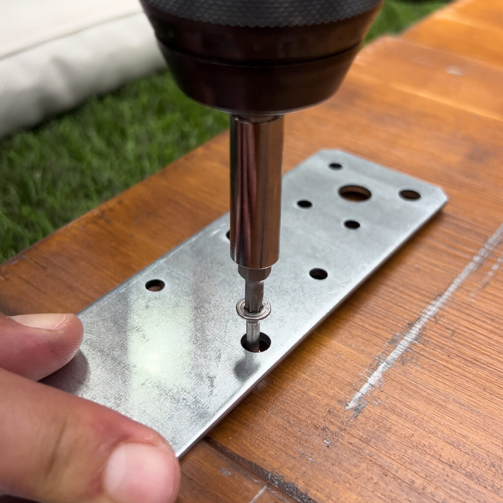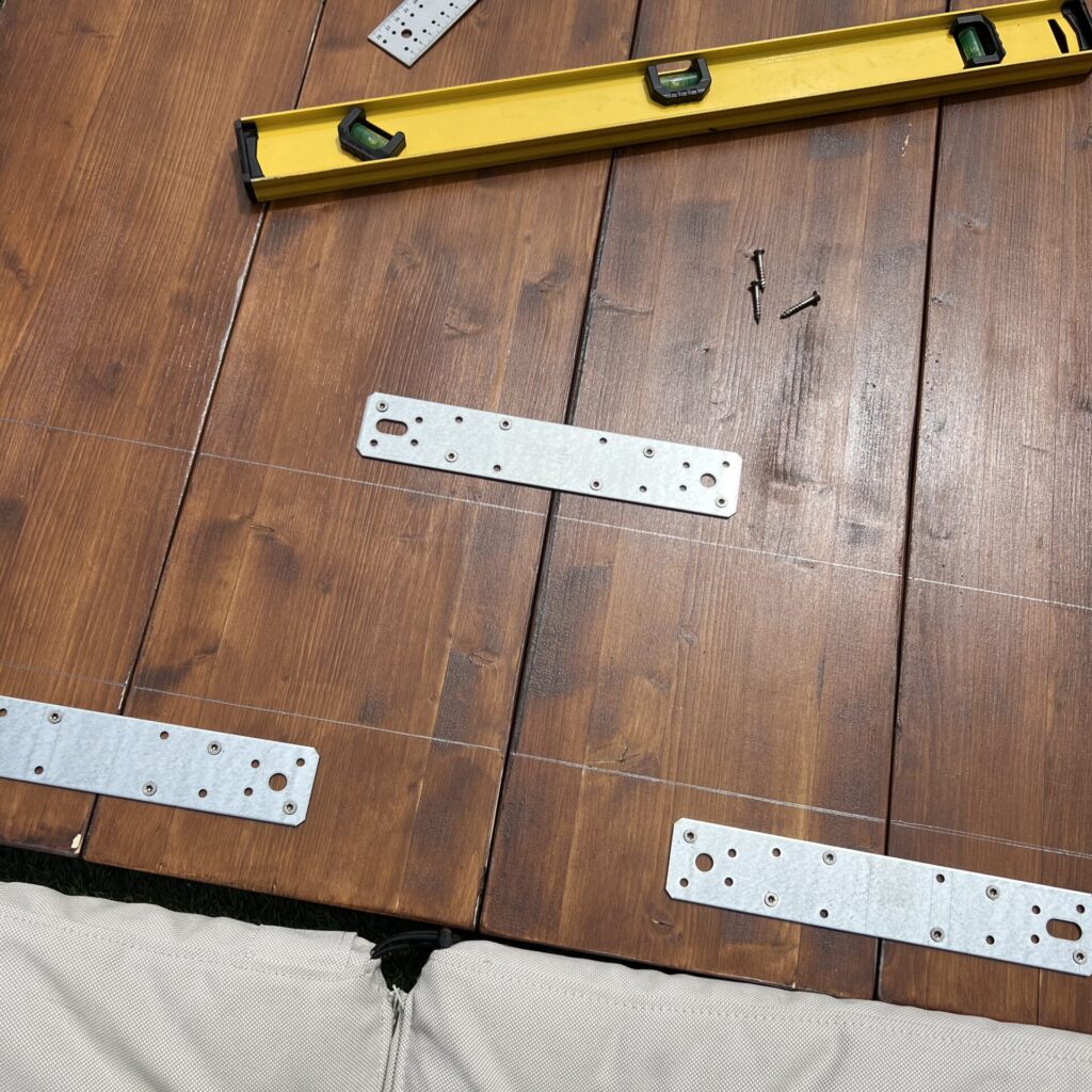 In totaal heb je 9 verbindingsplaten. Leg deze eerst uit: 3 links, 3 in het midden en 3 rechts. Schroef in elke plaat ongeveer 6 schroeven. Meer mag natuurlijk altijd. Gebruik altijd RVS schroeven, zodat ze niet gaan roesten. In verhouding zijn deze schroeven vrij duur, maar wel nodig. Zorg dat de schroef tussen de 50% en 75% aan lengte is ten opzichte van de dikte van je plank. Onze planken waren 42 mm dik en de schroeven 30 mm. Wij hebben geen last gehad van het splijten van het hout.