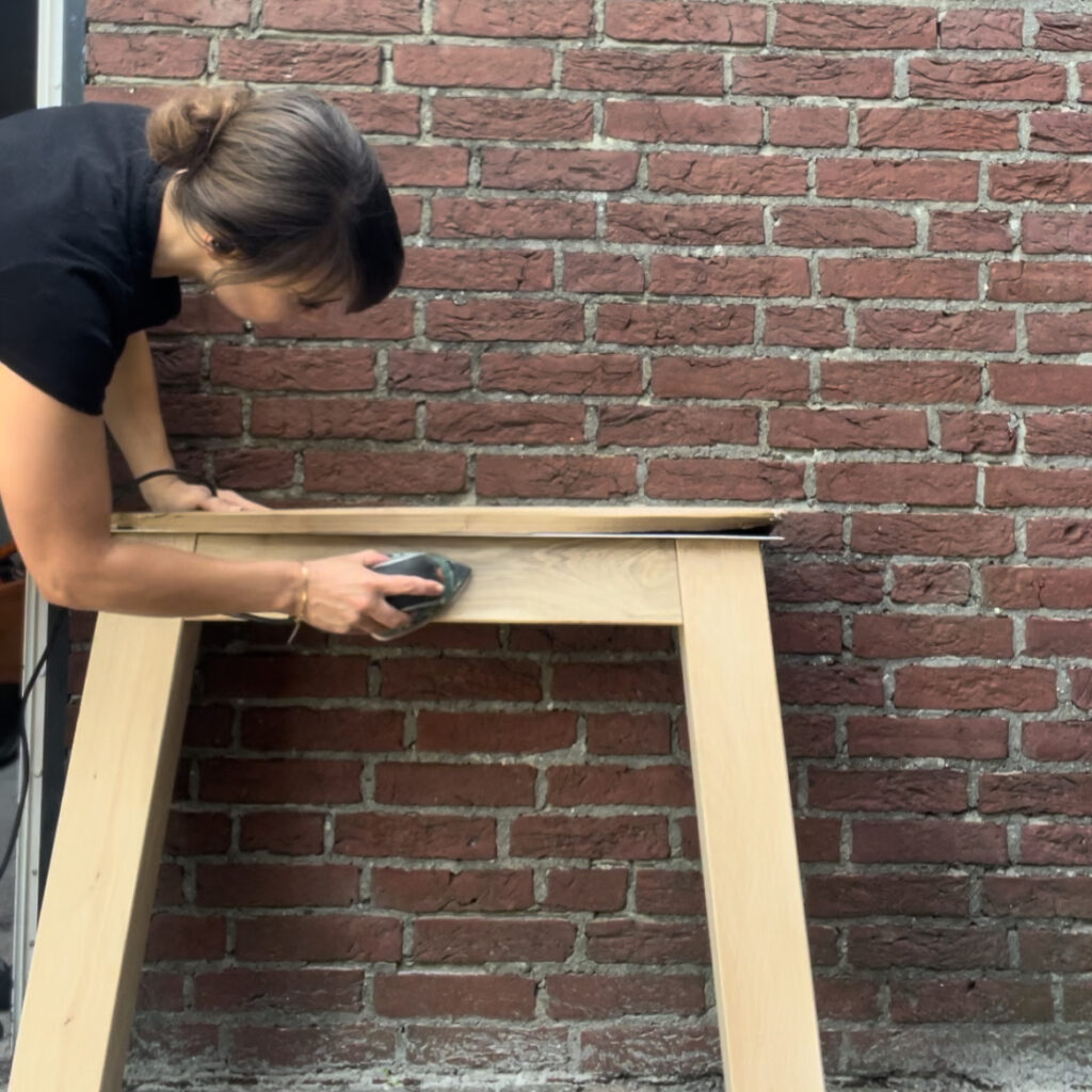 Bereid je voor: er gaat veel geschuurd worden. Draag eventueel mond-, neus- en oogbescherming van het fijnstof dat vrijkomt. Met een korrel van 120 tot 180 zit je goed. Alle planken en eventueel de tafelpoten moeten lichtjes opgeschuurd worden. Heb je alles voor de eerste keer geschuurd, dan kun je beits/vernis gaan aanbrengen.