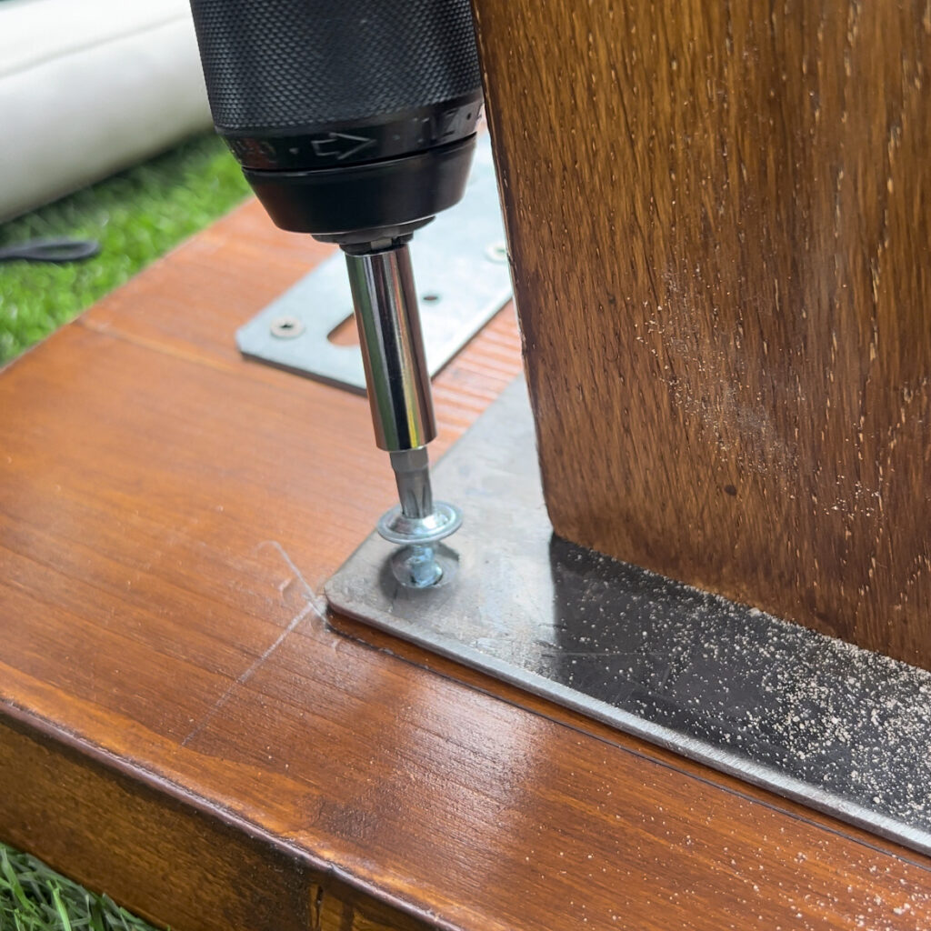 En we zijn alweer uitgekomen bij de laatste stap. Zet de tafelpoten terug op de uitgetekende plek en schroef ze vast.