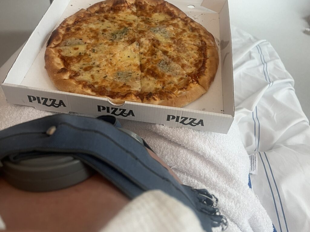 Zo’n twintig minuten later dan ik kwam hij binnen. Ik stierf van de honger. Hij ook. Het laatste wat we hadden gegeten was ons ontbijt. Daarna begon het circus. Het was inmiddels acht uur ’s avonds toen onze redder in nood, a.k.a. mijn schoonzusje, binnenwandelde met twee pizza’s en wat gezonde snacks. Denk nootjes, dadels, dextro, energierepen. Hemels. Althans dat dacht ik. Later bleek dat dit een rampzalig idee is voor iemand die op het punt staat te bevallen. Don’t be like me. Het is zure les geweest. Letterlijk.
